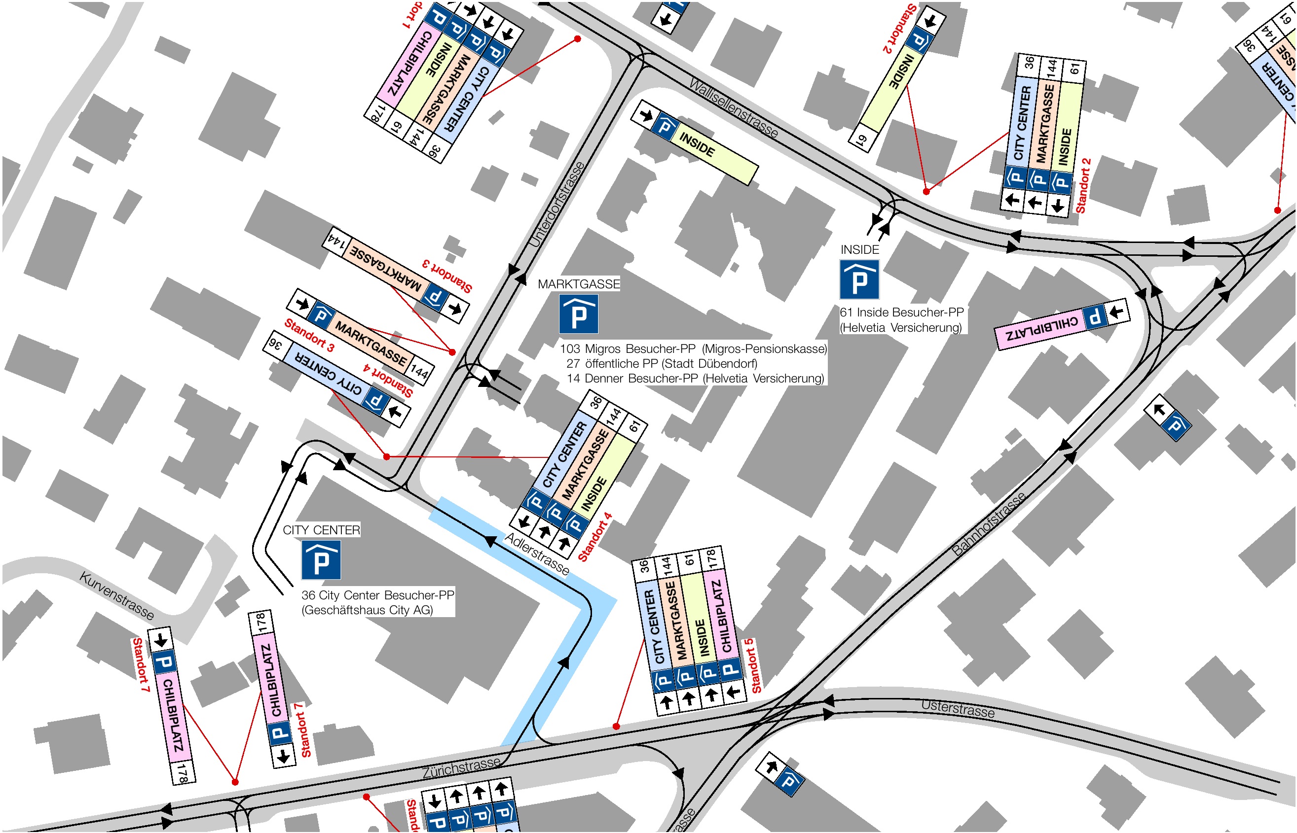 Zusammen mit drei privaten Partnern nimmt die Stadt Dübendorf im Zentrum ein neues Parkleitsys-tem in Betrieb. Ab März 2016 sollen die Parkhäuser City Center, Marktgasse und Inside sowie der oberirdische Parkplatz Chilbiplatz mit dynamischen Parkleitanzeigen ausgestattet werden. Die Anzei-gen werden die Anzahl freier Abstellplätze anzeigen sowie die Richtung zur jeweiligen Parkierungs-anlage weisen. Zur besseren Auffindbarkeit werden im Zentrum der Stadt an insgesamt neun Stand-orten Stelen mit Parkleitanzeigen installiert.
