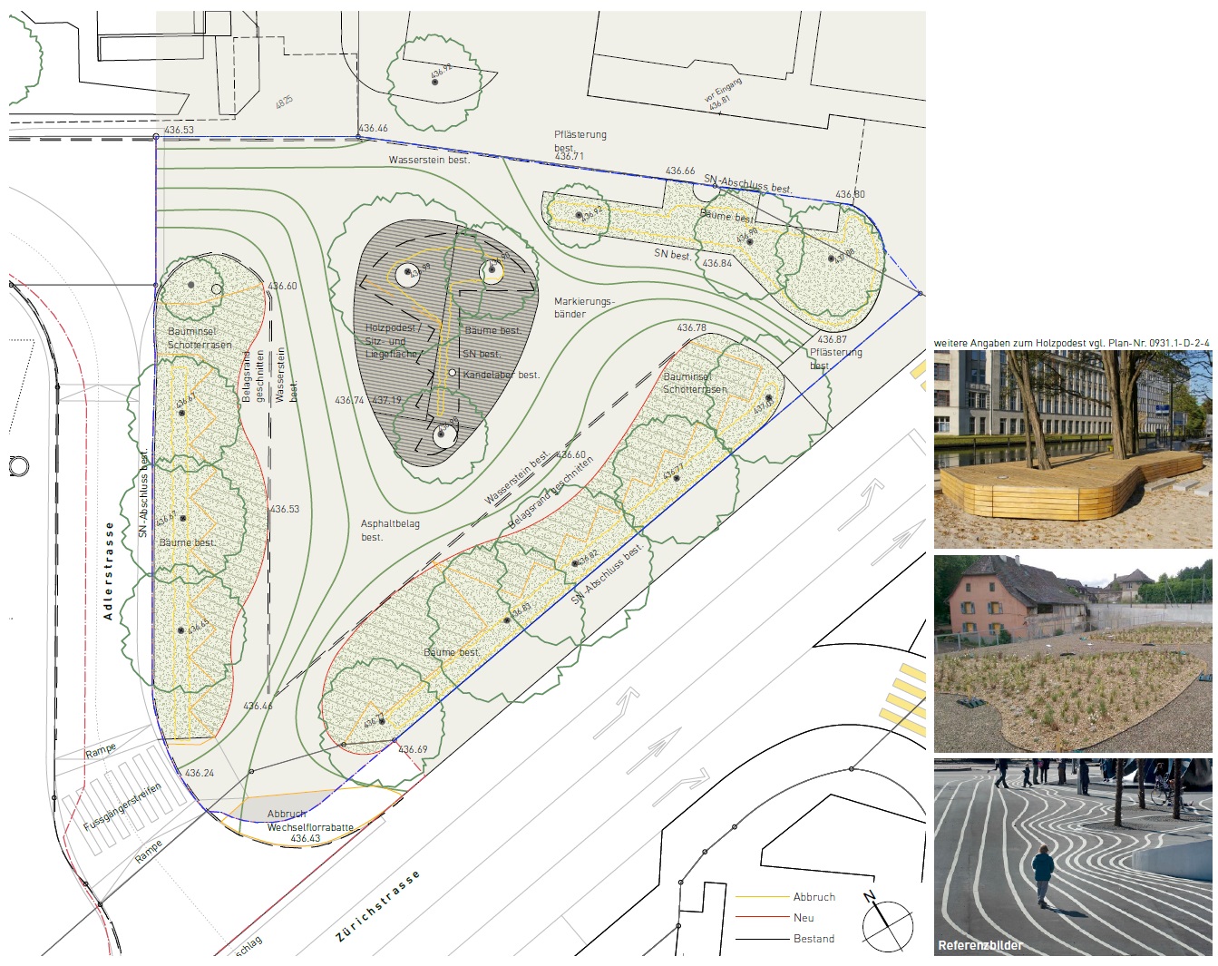 Mit Beschluss vom 12. November 2015 entschied der Dübendorfer Stadtrat, für die Bevölkerung einen neuen Begegnungsort mitten im Stadtzentrum zu kreieren: Der zentral gelegene Adlerplatz wird vom Parkplatz in einen begehbaren städtischen Platz umgestaltet. Die Aufwertung des Adlerplatzes erfolgt mit geringem baulichem Aufwand. Viele heutige Elemente, so beispielsweise sämtliche Baum-bestände, werden beibehalten und die Vegetationsinseln nur durch einen Schotterrasen ergänzt. In der Mitte des Platzes wird um die bestehenden drei Bäume eine Sitzmöglichkeit in Form eines Holzpodests geschaffen. Die bestehenden Kandelaber und Abfallhaie werden übernommen. Zudem werden 200m2 Asphaltfläche entsiegelt und mit Schotter ersetzt, der verbleibende Asphalt wird ge-stalterisch mit geschwungenen Markierungslinien ergänzt, welche die Bewegungsrichtungen der Fussgänger nachzeichnen.