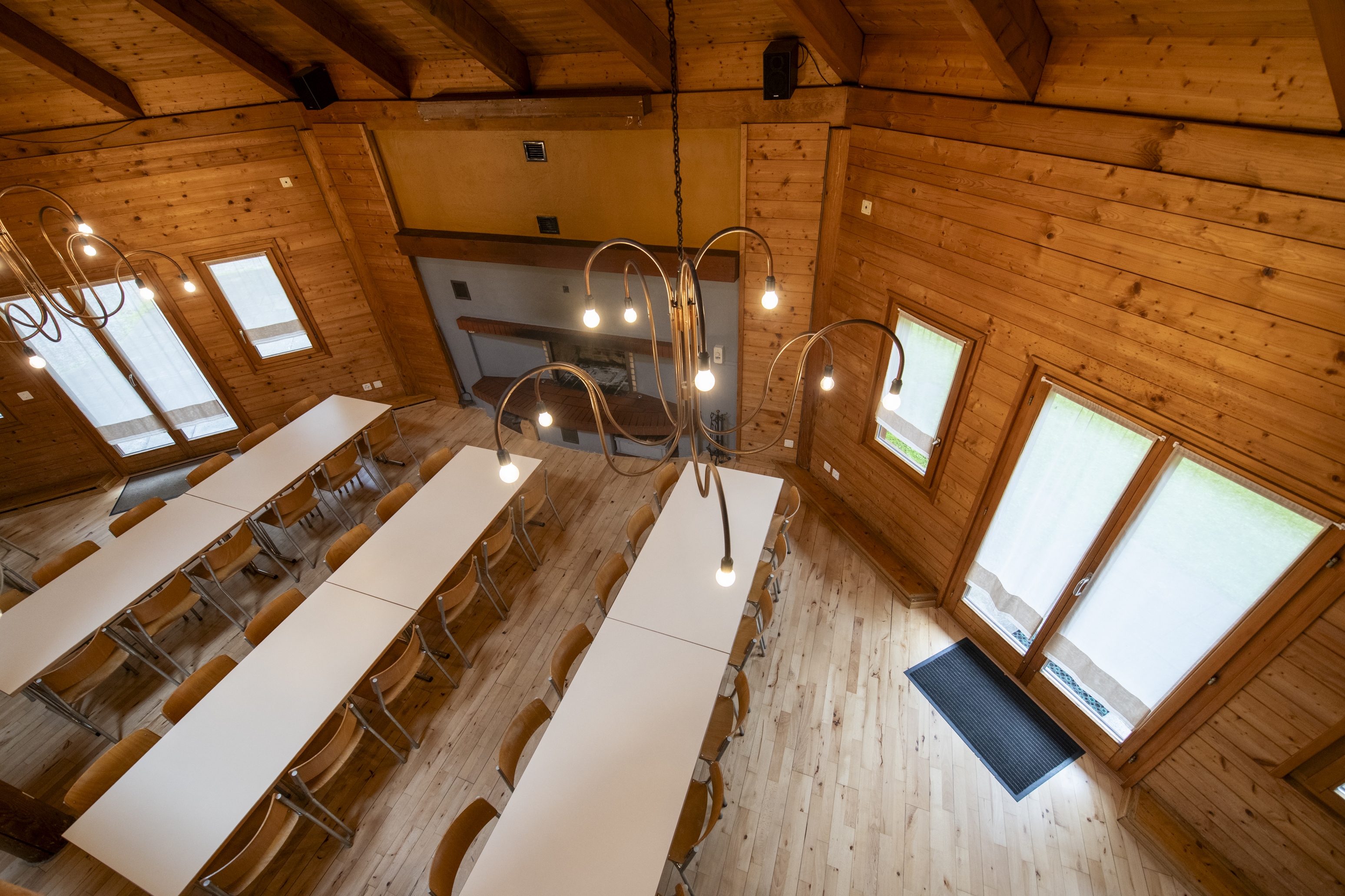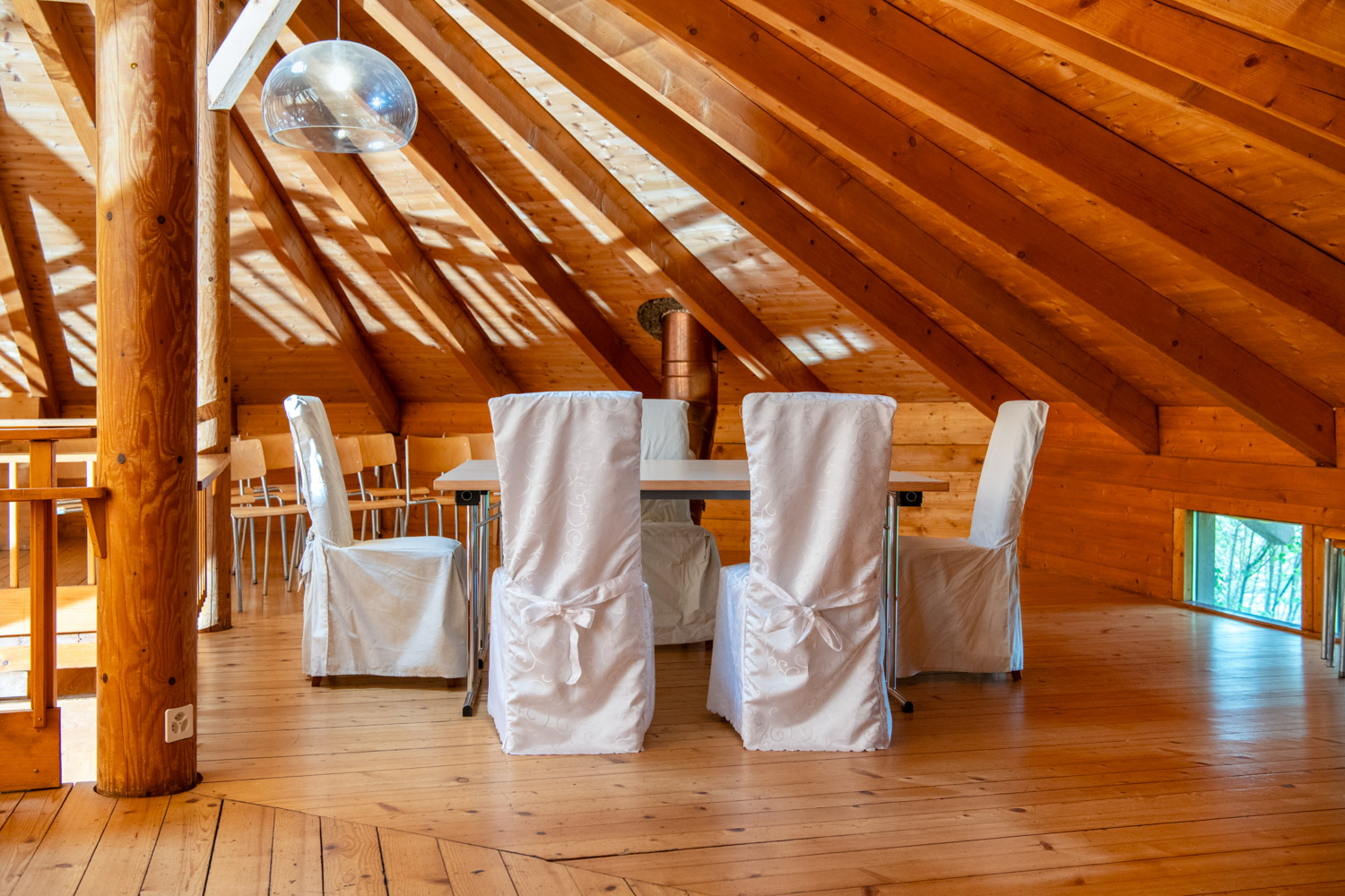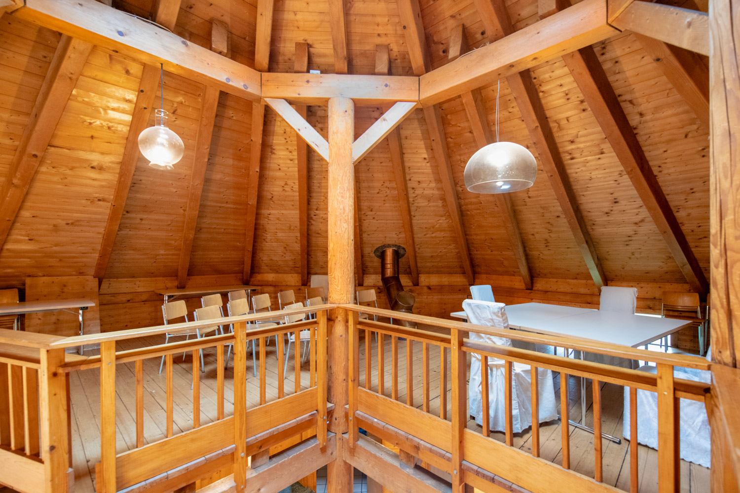Der Innenraum ist mit hohen Decken und einer Galerie ausgestaltet. Die perfekte Location für ein langes Fest bis in die Morgenstunden. Die Räumlichkeiten zeichnen sich aus durch die ruhige und störungsfreie Lage direkt am Wald.